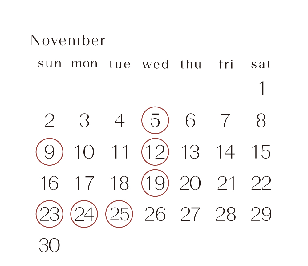 北条工務店 2025.10.4.Sat 11月の休館日のお知らせ 【休館日のお知らせ】 平素は格別のご愛顧を賜り厚く御礼申し上げます。 11月の休館日をお知らせ致します。 ご不明なことなどございましたら、いつでもお気軽にお問い合わせ下さいませ。 どうぞ、宜しくお願い致します。 ※赤色の○の日が休館日となっております。