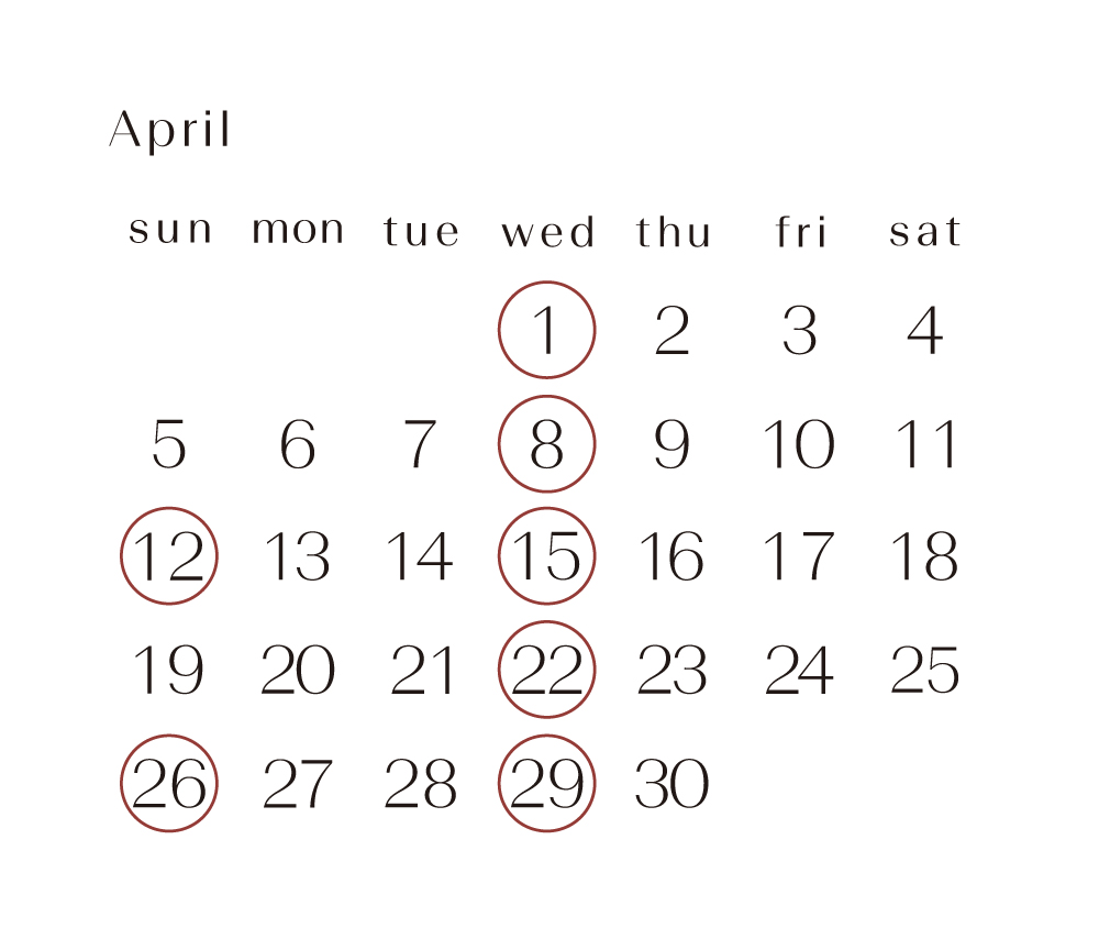 北条工務店 2026.3.3.Tue 4月の休館日のお知らせ 【休館日のお知らせ】 平素は格別のご愛顧を賜り厚く御礼申し上げます。 4月の休館日をお知らせ致します。 ご不明なことなどございましたら、いつでもお気軽にお問い合わせ下さいませ。 どうぞ、宜しくお願い致します。 ※赤色の○の日が休館日となっております。