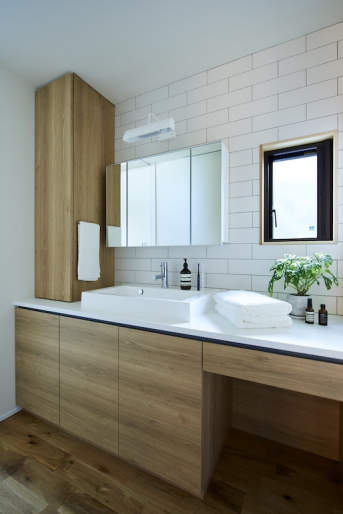 ウォークインクローゼットからは直接洗濯を干せる勝手口をつくり、洗面と脱衣場も分けて、生活しやすさを重視しています。キッチンの横にはパントリーも用意。可動棚にして階段下までたっぷりと収納を確保しました。落ち着いた印象の和室は、隣地からの視線が気にならないように地窓を設置。将来的には平家感覚で住みたいから、ここが寝室に。今も10年後も20年後も日々の日常が、家族と共に楽しく暮らせる家に仕上がってします。