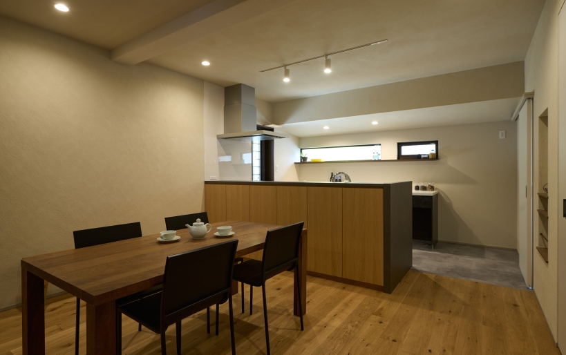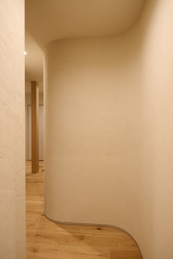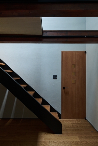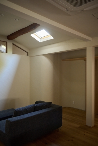 LDK空間など間取り的に窓を壁に新設できない場所は、天窓を設けたり室内窓を設けて採光を確保。一部アールの壁にするなどで視覚的にも閉鎖感を軽減させるような工夫もしています。内装は珪藻土で仕上げ、それぞれのお部屋ごとにあった塗り方を客様と何度も考え決定していきました。元々蔵だったスペースはご主人の寝室へ、せっかくなので遊び心のある左官仕上げの内装に。