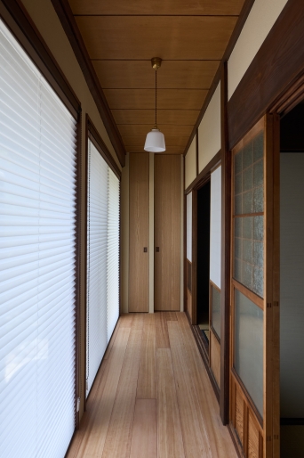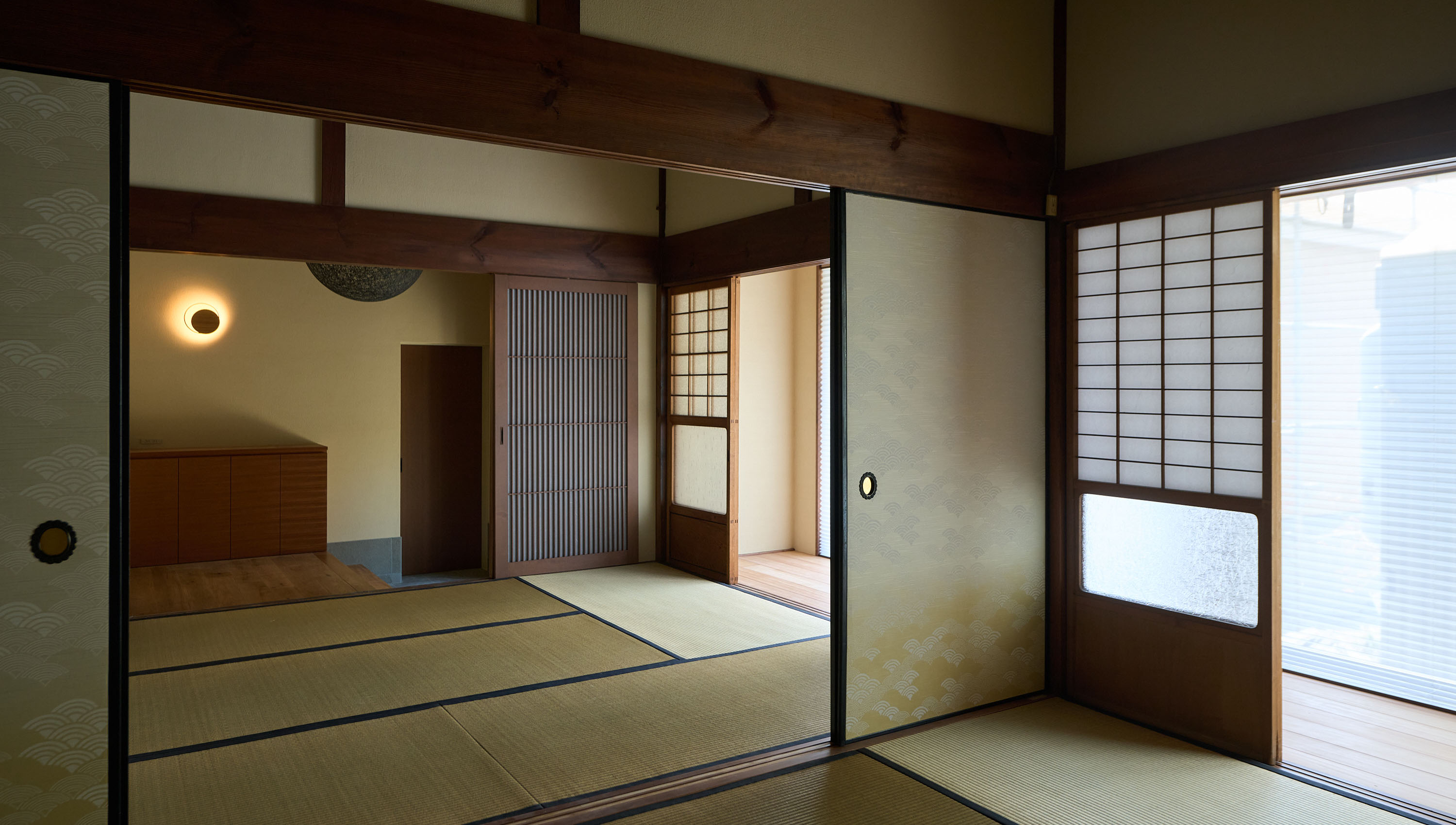 母屋の部分は耐震工事や断熱工事など、これからも長く暮らしていくからこそ性能の部分もしっかりと考えて工事をしています。元々隠れていた梁などは全てを見せるのではなく、一部ポイントで表しにすることで全体の雰囲気が重くなりすぎないように配慮。既存の木部は全て柿渋で塗装することで、新旧の空間がうまく繋がるようにしています。和室は仏間と客間だけを残し、使いやすいように収納部分なども整理した間取りに変更。既存建具などもうまく組み合わせてコストバランスも調整しています。