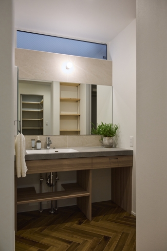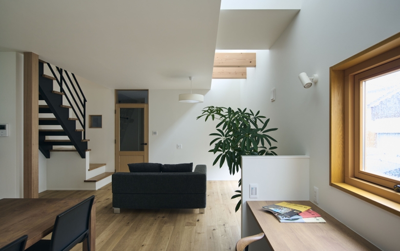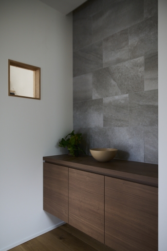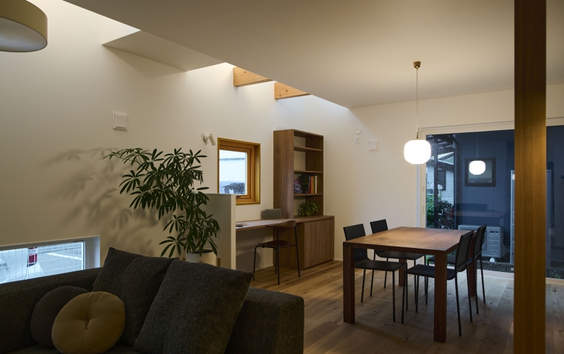 敷地の隣がちょうど駐車場だったため、採光は確保しつつも目線や排気ガスなどに配慮した窓の位置で計画し、リビングの一部を吹き抜けに。窓を閉めていても快適に過ごせるよう、建物全体の気密性を高めた上で、第三種換気システムのルフロを導入しています。玄関から入ると正面には印象的なタイル張りの壁が目に入り、ウォルナットの造作収納が落ち着いた空間を演出しています。LDKはエアコン効率にも配慮し、採光のための吹き抜けを一部に設け、化粧梁を配置して変化を付けています。ワークスペースでは在宅仕事をしたり、お子様が勉強をしたりと、使い勝手のいいゆとりのあるサイズ感に。
