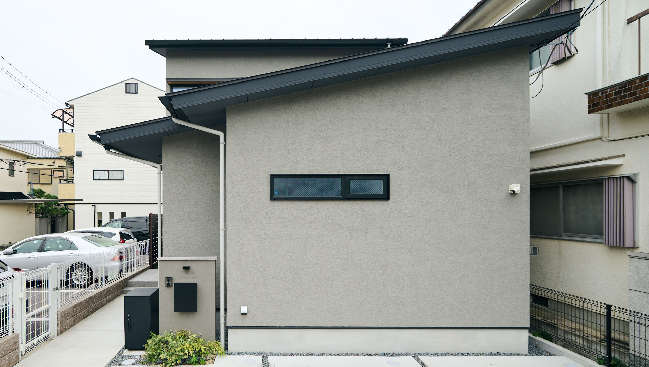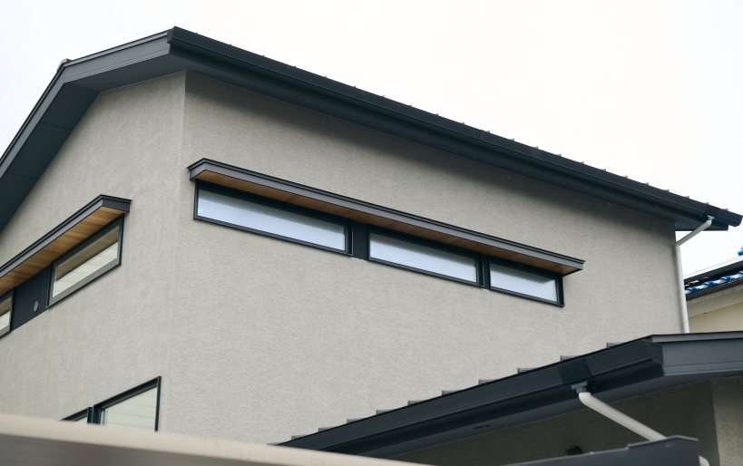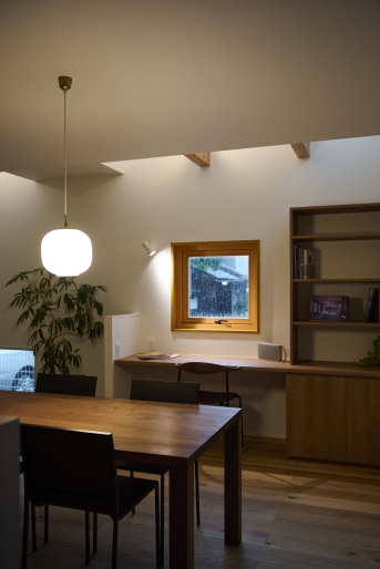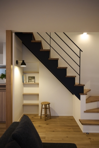キッチンはパントリー、洗面脱衣と一直線に配置し、家事などがスムーズに行えるような動線に。階段下にちょっとした本棚スペースを設けることで、お子様が小さいうちはLDKと緩やかに区切られたキッズスペースなどとしても使用いただけます。外壁は道路に面した部分は塗装で仕上げ、建物と隣接し外から見えない部分はサイディングで仕上げるなど、土地の状況に合わせてコストバランスもうまく調整していきました。ご家族がゆっくりと過ごせる暖かなお住まいが完成いたしました。