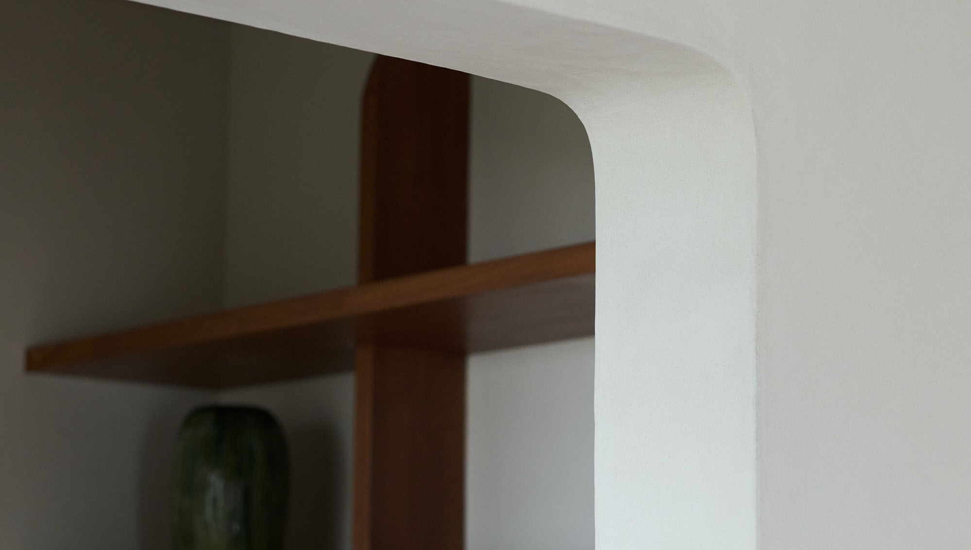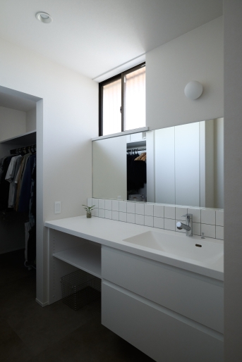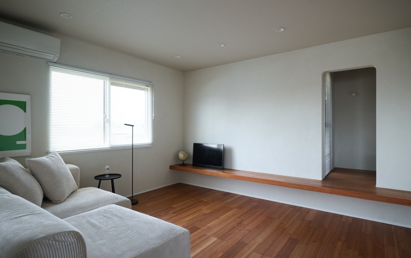 お住まいづくり当初からの希望でどこかにアールのデザインを取り入れたかった奥様、ご自身でパースをつくって検討してくださったり、何度も考えて最終的にはヌックの入り口をアールで仕上げ、柔らかな曲線が美しい空間に仕上がりました。ヌックの中には掘り込みのデスクと収納棚を造作しています。テレビ台兼ベンチは浮遊感のあるデザインを生かすために下に収納は設けずシンプルに。既製品の洗面台は、いくつもの中から選んだタイルを使った造作のカウンターと組み合わせてこだわりの空間に。すぐ横にはクローゼットを設け、身支度もスムーズに。家族それぞれのこれからの暮らしが豊かになるようなお住まいが完成いたしました。