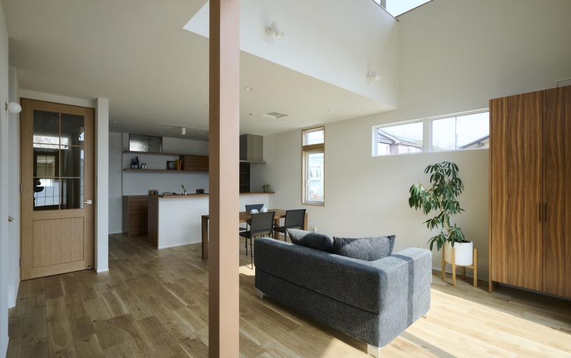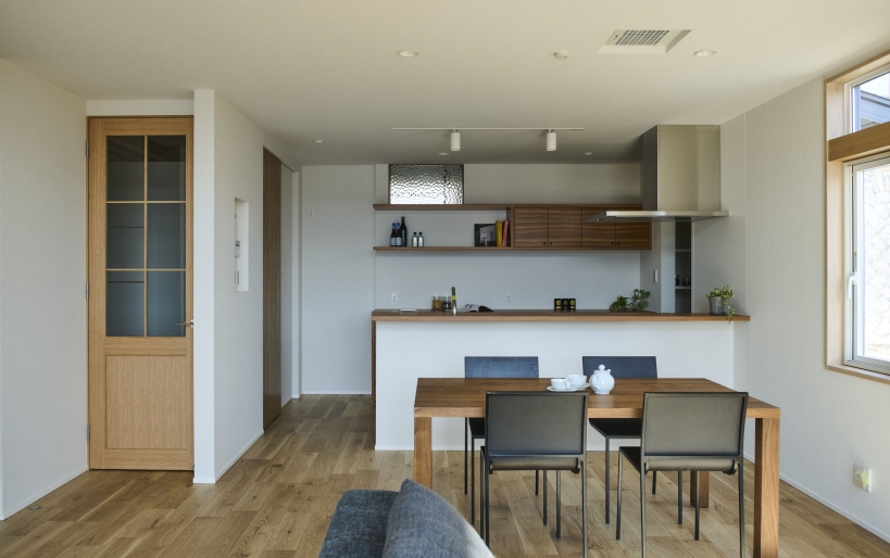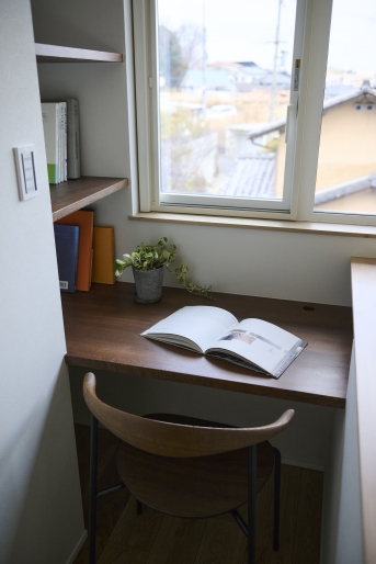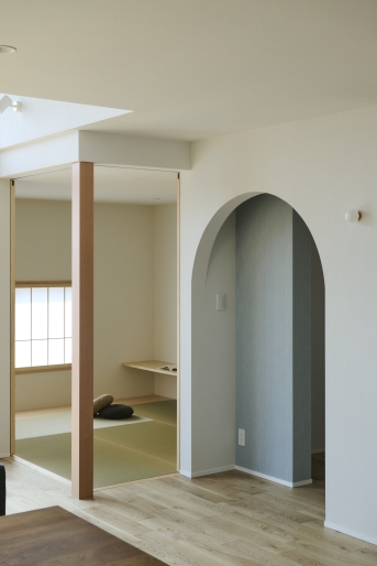 南側にひらけた高台の土地の利点を活かして、陽の光をふんだんに取り込めるよう玄関はあえて正面ではなく西側に。南側には吹き抜けに大きな窓を設けたLDKと、和室を配置して明るく開放的な空間に。対面式キッチンの背面には造作のカップボードを設置し、キッチン横にはパントリーも設けています。リビングからアクセスできる和室は、お子様のお雛様を飾ったり来客時には客間としても使用が可能です。アールの壁に切り取られた奥様の書斎はゆるやかにリビングと繋がり、家族の気配も感じられるように。