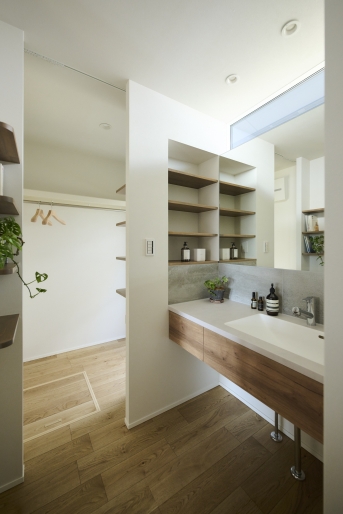 造作洗面の近くにはファミリークローゼットを設け、直線で繋がった脱衣兼ランドリースペースからすぐに洋服などを収納できるような動線に。将来的に乾燥機も設置できるように造作の作業台も設けています。玄関の天井はレッドシダーの板張りにして、本物の木の暖かな空気を感じられる空間に。シューズクローゼットにはアウトドア用品やベビーカーなども収納できます。