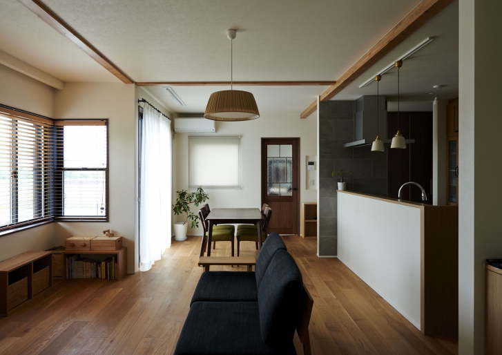 こだわったのは、ソファとテレビボードまでの距離と視線の抜け。テレビボードとの距離はお打ち合わせの際に実際にソファを置きながら距離を測り、窓の位置も遮るものがなく広がる田園風景を生かせるように何度も検討を重ねました。