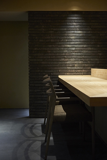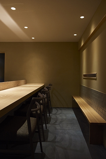 外観は左官で仕上げた土感のある壁とシンプルな照明がひとつ。そして、年季の入った扉。さりげなく控えめでありながらも、どこかずっしりとした芯を感じる店構えはいつまでも眺めていられるくらい美しい佇まい。少し重たい扉をゆっくりと開くと、目の前に広がるのは6m程奥ゆきのある店内までのアプローチ。照明の照度、壁の色、天井の素材、ディティール…全てを計算したその空間は、一歩ずつ足を進める度、まるで路地裏に迷い込んだかような感覚になります。
